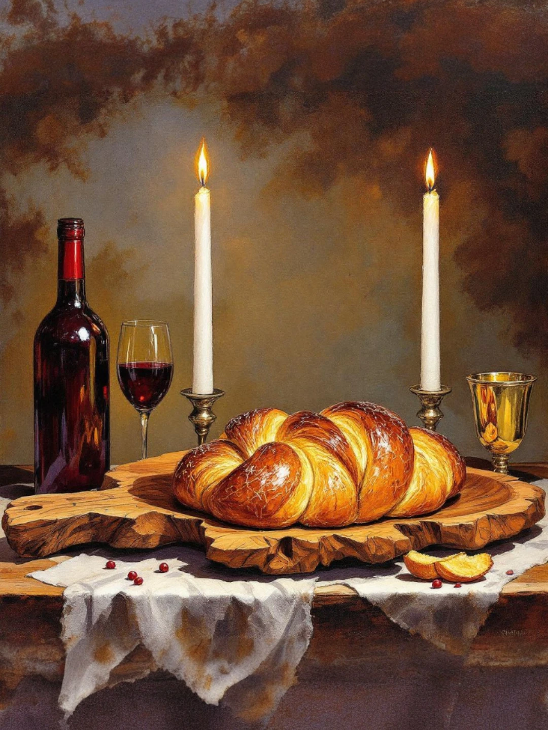 The Jewish Shabbat is not only the holiest day of the week, but the holiest day of the year! One day of the week is set aside for rest, prayer, family, and food. The traditional Shabbat meal includes making kiddush over wine or grape juice in a special kiddush cup, as well as special braided challah loaves served on a challah board under a decorative challah cover. Candles are lit in special Shabbat candlesticks.